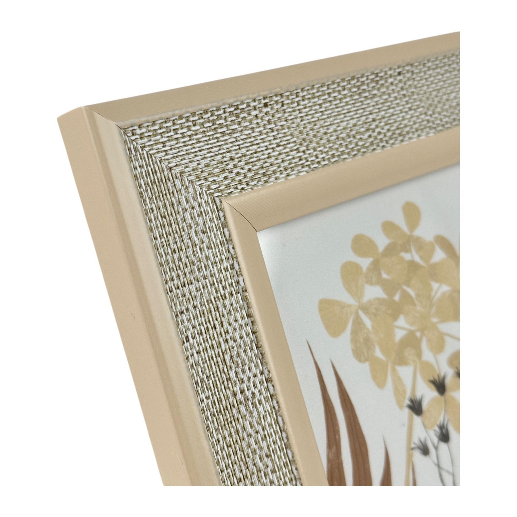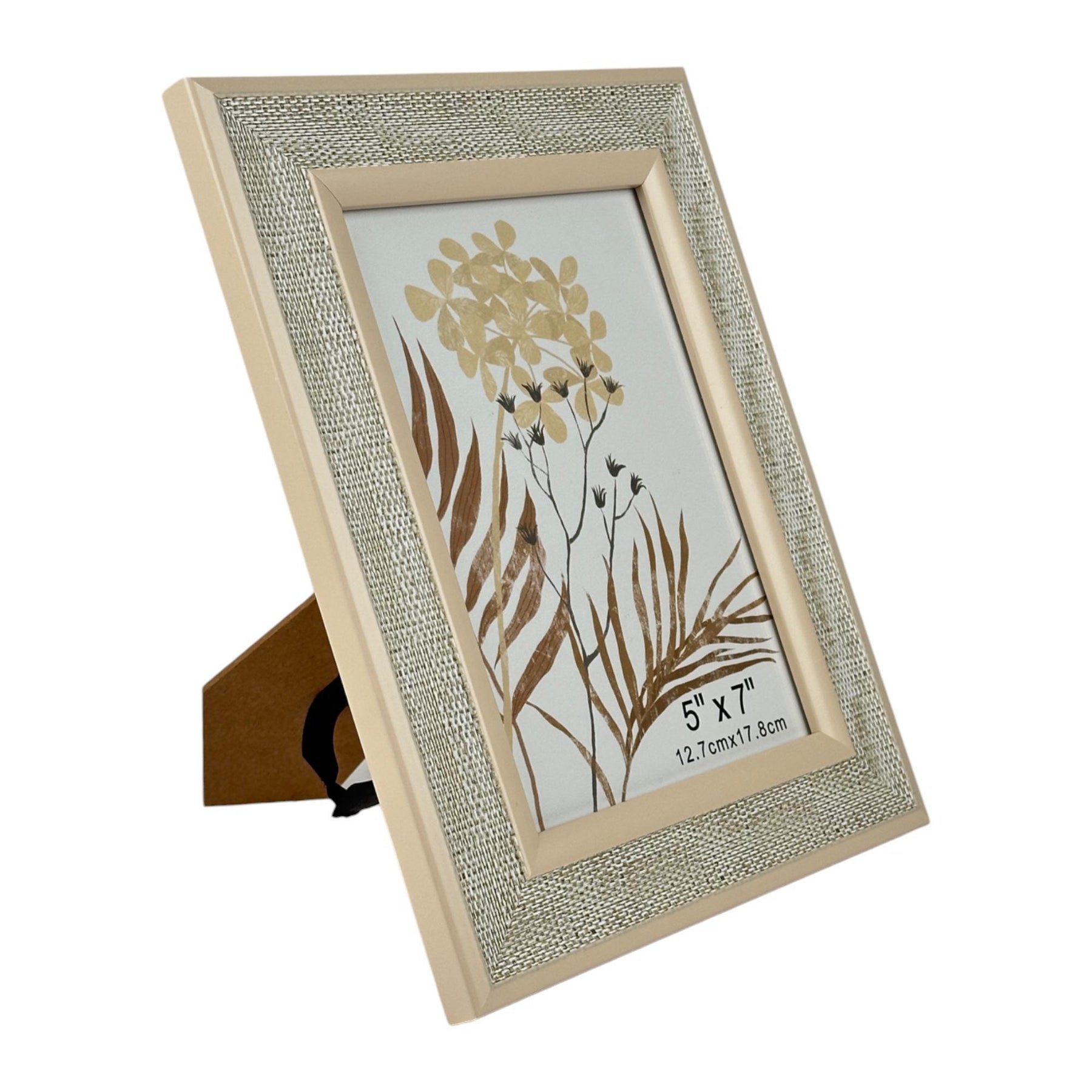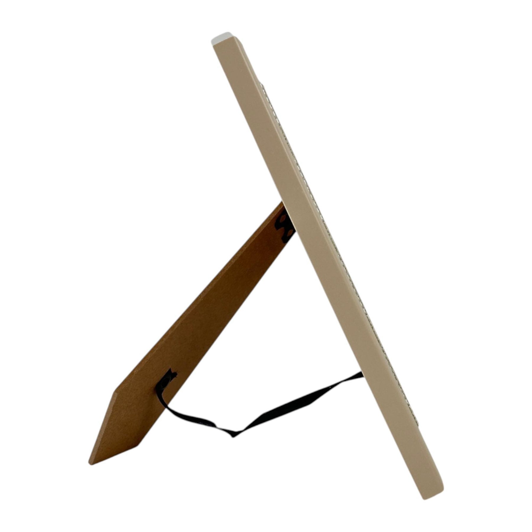 Portarretrato de madera beige con un borde texturizado. Composición: 50% poliestireno 20% vidrio 5% papel 25%mdf.