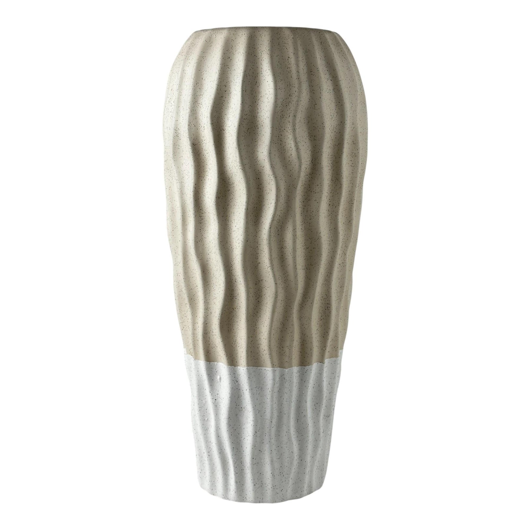 Florero o jarrón decorativo con textura y rayas, en tonos beige y blanco.  Composición: 100% cerámica.