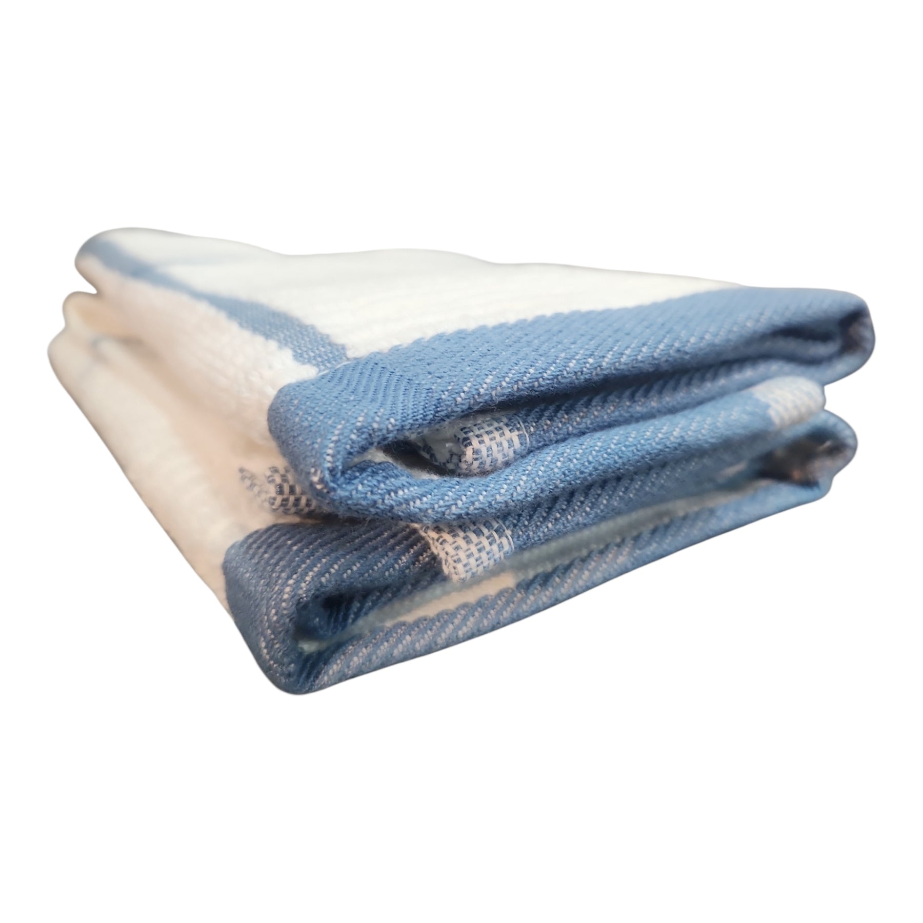 Set de 2 paños de cocina de color blanco con bordes azul, diseñado para uso doméstico.